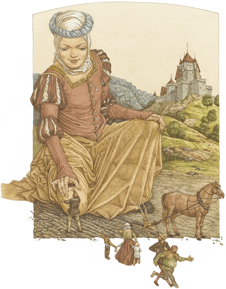 Однажды юная дочь одного рыцаря-великана отправилась вниз, в долину. Была она очень любопытна, и захотелось ей узнать, что там внизу творится. Добралась она почти до самого Хаслаха. Увидела она перед лесом пашню, на которой трудились местные крестьяне.