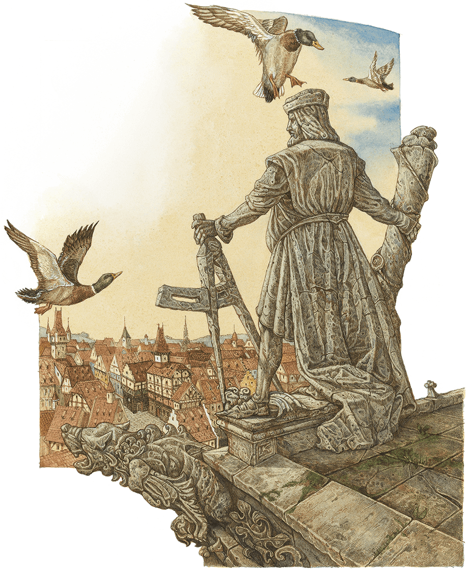 Мастерт Герхард знал, что стройка идёт быстро, без простоев. Но ведь чёрт может дьявольски быстро работать! Однажды поднялся зодчий на второй этаж одной из башен, который и тогда уже выглядел таким же, как сейчас. И первое, что он заметил сверху, были утки, которые с гоготом взлетали из водяного потока, который дьявол уже подвёл к строящемуся собору! Тогда мастер в гневе произнёс: