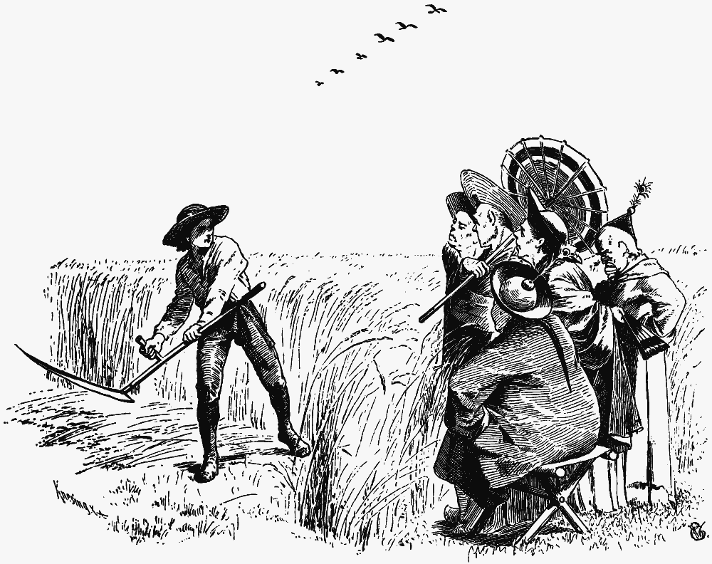 Но на неё и смотреть-то не думали, потому что всюду встречались ему мужики, которые несли на плечах такие же славные косы, как у него. Однако в конце концов посчастливилось и ему оказаться на каком-то острове, где жители о косе знать не знали, ведать не ведали. Там, когда, бывало, созревала рожь, вывозили пушки на поля и стреляли по ней. Но это было неудобное изобретение: один стрелял поверх нивы, другой попадал вместо стебля аккурат в самый колос и сшибал его, и много колосьев пропадало даром – а сверх того стоял невыносимый грохот. А наш молодчик пошёл на поле и скосил хлеб так тихо и быстро, что островитяне рты разинули от удивления.