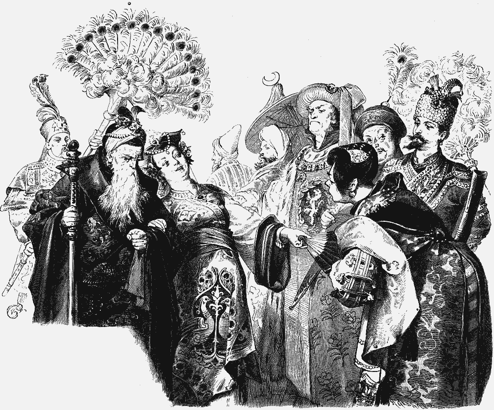 Их рассортировали и расставили в ряд по достоинству и положению: сначала короли, потом – герцоги, князья, графы и бароны, а в конце – дворяне. И повели королевну по этим рядам, а она непременно находила что-нибудь сказать по поводу каждого. Один был для неё толст («Винная бочка!» – говорила она). Другой длинен и худ («От длинного да худого – проку никакого!»). Третий был слишком уж невысок («короток да полноват сей муж, оттого неуклюж»). Четвёртый бледен («бледная смерть»), пятый слишком румян («красный, как петушиный гребень»), шестой недостаточно строен («свежее дерево за печью сушено – да покороблено») – и так по адресу каждого находила она что-нибудь заметить, но больше всего потешалась над добродушным королём, который стоял в ряду выше других и у которого подбородок был несколько загнут вперёд.