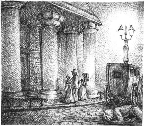 Давенант стал на середине вестибюля, мешая публике проходить, оглядываясь и ища глазами тех, ради кого принял эти мучения. Огромная дверь в зал театра была полураскрыта, там блестели золото, свет, ярко озаренные лица из прекрасного и недоступного мира смеялись на фоне занавеса, изображающего голубую лагуну с парусами и птицами. Тихо играла музыка. Большое зеркало отразило понурую фигуру с бледным лицом и черным от пыли ртом. Это был Давенант, но он не узнал себя.