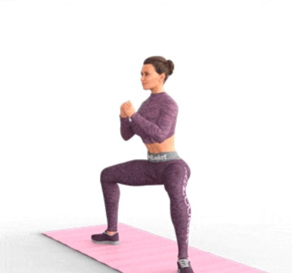 ИП: встать ровно, ноги вместе. Для упражнения делают выпад ногой вперед, сгибают колено и голень так, чтобы голень «задней» ноги и бедро «передней» ноги лежали параллельно полу. Теперь в точке выпада ногу фиксируют, делают 3—4 небольших маха (пульсация), распрямляют колени и поднимаются в высокий выпад.
