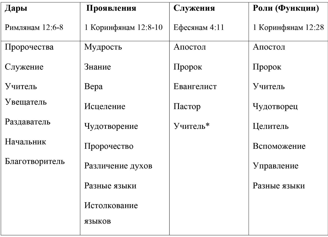 Ниже перечислены все проявления даров, сами дары, служения и роли (функции) без разделения их на категории, но с определениями и ссылками из Библии. Это поможет вам ухватить библейское значение, а не то, которое является общепринятым и не всегда верным.