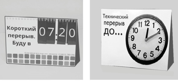 Допустим, в вашей компании нефиксированный перерыв. Оговорите в стандарте компании, чтобы сотрудники информировали клиентов, сколько он длится, когда начался и во сколько закончится. Для этого удобно использовать специальные таблички, где они будут указывать время начала и окончания перерыва и, если допустимо, номер мобильного телефона.