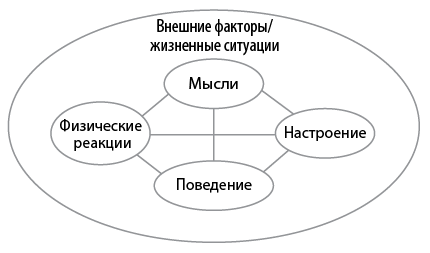 Обратите внимание, что все пять зон на рис. 2.1 взаимосвязаны. Линии связи показывают, что каждая отдельная часть жизни влияет на все остальные. Например, изменение поведения влияет на мысли и самочувствие (физическое и эмоциональное). Поведение может повлиять на внешние события и нашу жизнь. Точно так же изменение стиля мышления влияет на поведение, настроение, физические реакции, что может привести к изменениям в окружении. Если мы научимся понимать взаимосвязь этих пяти составляющих нашей жизни, то сможем разобраться в своих проблемах.
