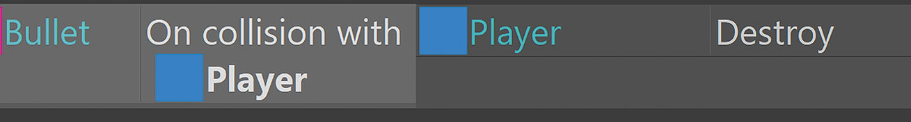 Логика поведений в Constuct. Слева – условие (пуля коснулась игрока), справа – событие (игрок уничтожен)