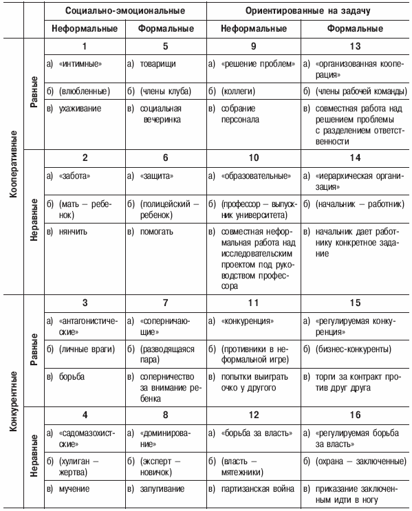 3. Ориентация на задачу – социально-эмоциональная ориентация. «Близкие друзья», «муж и жена» – социально ориентированы, «интервьюер и поступающий на работу», «бизнес-соперники» – ориентированы на задачу.