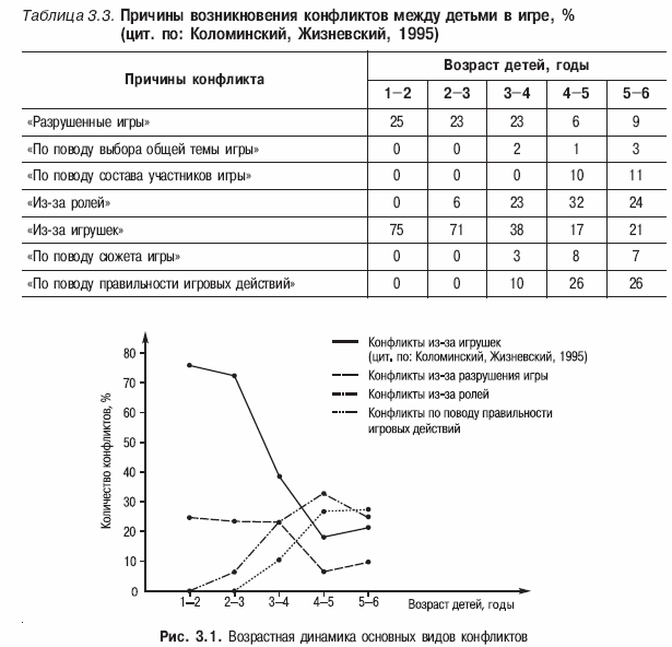 С различными интерперсональными конфликтными явлениями мы сталкиваемся довольно рано. Как зарубежные, так и отечественные исследователи относят их появление к возрасту одного-двух лет (японские воспитатели, например, предлагают начинать работу по обучению эффективному поведению в конфликтах именно с этого возраста). В одном из немногих исследований на эту тему, принадлежащих Я. Л. Коломинскому и Б. П. Жизневскому были собраны и проанализированы 397 протоколов наблюдений за конфликтами детей в ходе различных игр. При этом были выделены типичные причины конфликтов между детьми разного возраста (табл. 3.3).