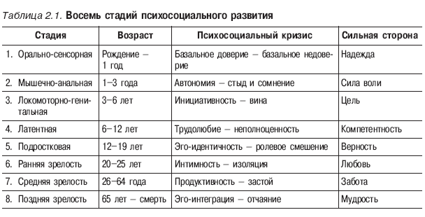 Эриксон выделяет в общем жизненном цикле восемь психосоциальных стадий (табл. 2.1). Каждая из этих стадий развития сопровождается кризисом, который Эриксон рассматривает как поворотный момент, возникающий вследствие достижения определенного уровня психологической зрелости и предъявляемых к индивиду социальных требований. Это означает, что на каждом возрастном этапе возникает своя специфическая, требующая решения проблема. Успешное разрешение кризиса является залогом дальнейшего развития здоровой личности и необходимым фактором эффективного проживания последующих стадий.