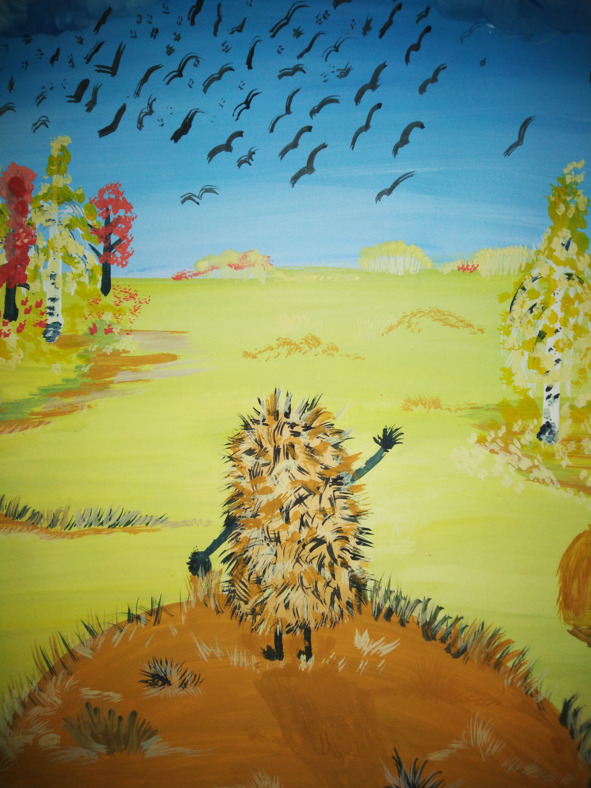 – Подожди, подожди! Не улетай! – ежик совсем запыхался, подбегая к стае грачей. Одна из птиц отпрыгнула вбок и устремилась сторону, тяжело дышавшего ежика.
