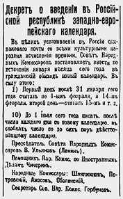 Председатель Совета Народных КомиссаровВ. Ульянов (Ленин).Обсуждался вариант как жесткого перехода сразу – именно его поддерживал Ленин, – так и более мягкая трансформация в течение 13 лет (предполагалось убирать одни сутки каждый год). В итоге декрет об одномоментном введении в Российской республике западноевропейского календаря принят на заседании Совнаркома 24 января (6 февраля) и 26 января (8 февраля) подписан Лениным.