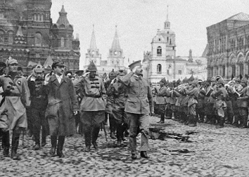 Народный комиссар по военным и морским делам Лев Троцкий (справа) принимает военный парад на Красной площади в Москве в честь Третьего конгресса Коминтерна.1921