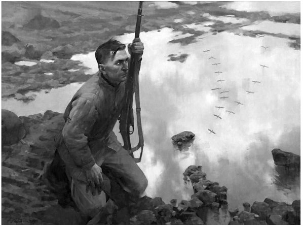 Мы ждём какой-нибудь час, а фронт уже кажется каким-то далёким. Где-то аукают два орудия – словно в другом мире. Облака плывут над нами, сквозь серое и белое уже густо проступает синева. В этих местах река похожа на заячий след: кружит, петляет, бросается из стороны в сторону. Пожилой ездовой Галкин, который знает абсолютно всё, даже больше, чем Гельтур, рассказывал мне, какой здесь бывает разлив. Река затопляет все окрестные низменности и становится похожей на озеро, заросшее камышом. Только вместо камыша верхушки затопленных деревьев.