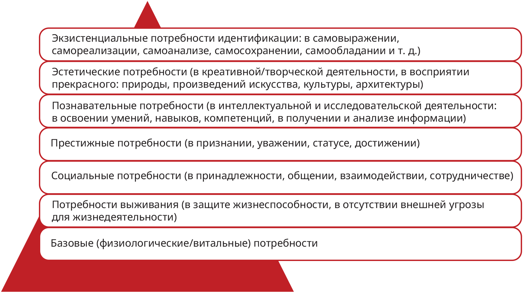 РИСУНОК 7 Модель «Пирамида потребностей Маслоу», состоящая из семи уровней. Источник – авторская сборка на основе анализа материалов сборника «Современная психология мотивации»
