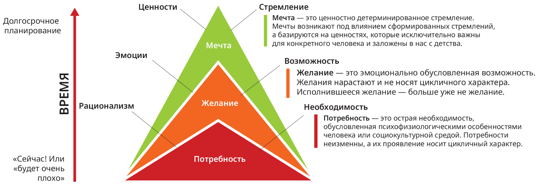 Потребности управляются желаниями. Желания, в свою очередь, формируются под влиянием мечты, где мечта понимается как идеальный образ, имеющий самостоятельное нематериальное начало, существующее вне пространства и времени.