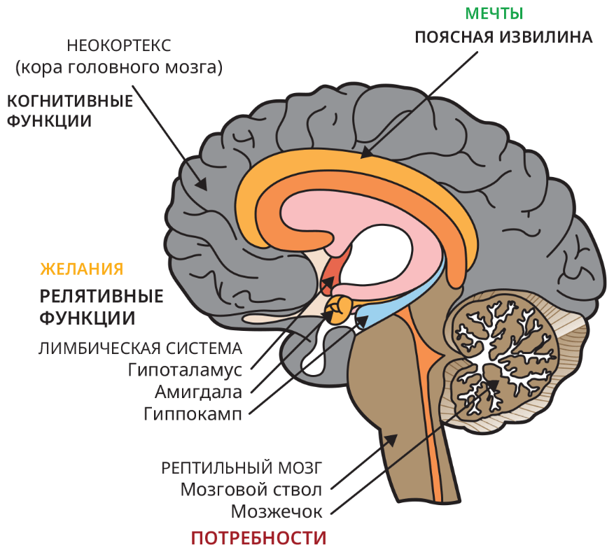 РИСУНОК 9 Мозг человека в разрезе с указанием локаций потребностей, желаний и мечтаний