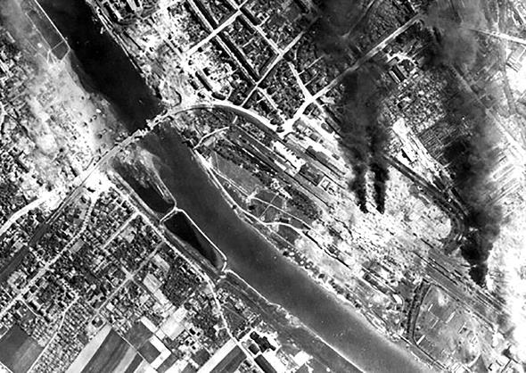 Аэрофотосъемка последствий американской бомбардировки Пирны 19 апреля 1945 г. Видны разрушенный мост через Эльбу и горящий вокзал