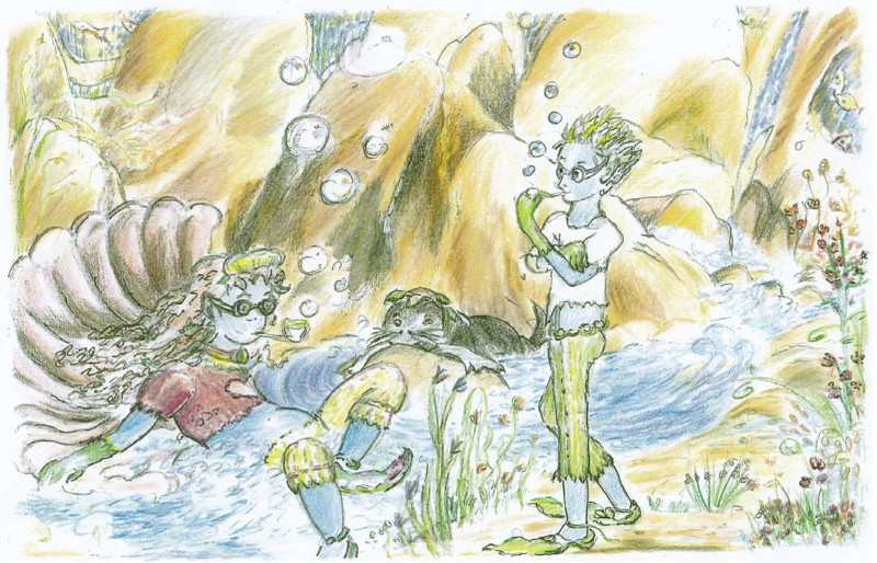 „Na, badest du schon wieder“, sagt Takko zu Kidschi und macht mit seiner langen Meerschaumpfeife viele kleine Blasen. Die Kinder von Meeresgöttern lieben es nämlich, an ihren Meerschaumpfeifen zu saugen, und man trifft sie eigentlich nie ohne an.