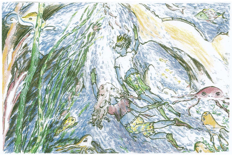 Unten auf dem Meeresgrund, da wo die Felsenhöhle ist, badet Kidschi, die Tochter von Poseidon dem Meeresgott. Hier ist das Wasser nämlich schön warm, weil genau unter dem Meeresboden Heizungsrohre von den Menschen verlegt worden sind. Kidschi ist siebzig Jahre alt, aber das hört sich nur für uns uralt an. Denn bei den Meeresgottfamilien zählen siebzig Jahre soviel, wie bei den Menschen sieben Jahre.