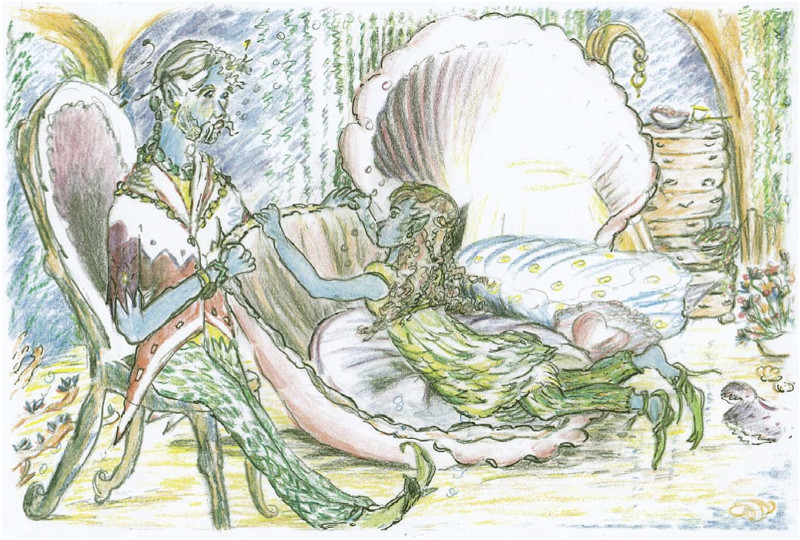 „Ich will noch nicht in meine Schlafmuschel, Papa“, sagt Kidschi und schmiegt sich auf Poseidons Schoß.