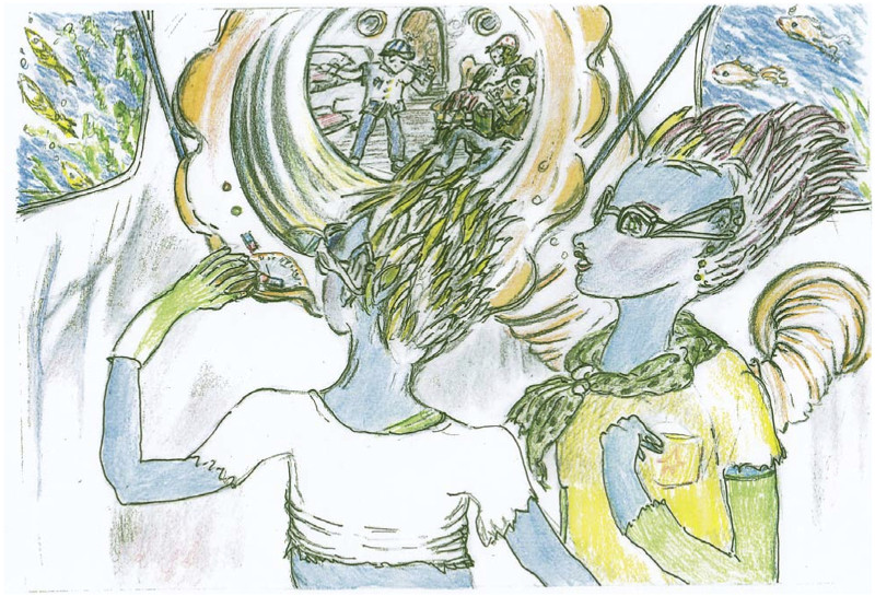Wie oft haben die Väter von Takko, Kidschi, Miriam und all den anderen Kindern, die noch im Meer wohnen, schon gepredigt, dass sie auf jeden Fall das „Fischkaviarsaugen“ nachlassen sollen, aus Sorge darum, weil es sie fremd und auch verrückt werden lassen könnte. Doch man sieht ja, bei Takko hat es nichts genützt …