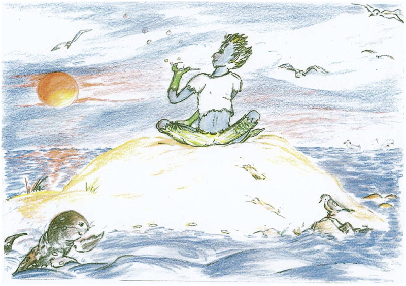 Ja, da sitzt er nun in der Sandmulde, oben auf seiner Sandbank, saugt den leckeren Fischkaviarsud ein und atmet Luft. Dabei winkt er den Möwen zu und träumt davon, ein Mensch zu sein …