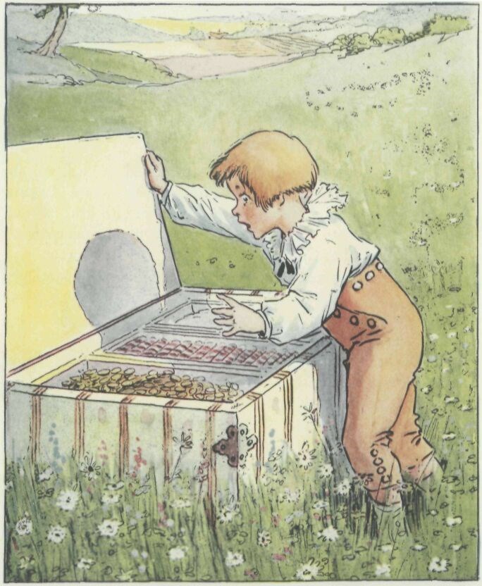 And when he came to the middle of the great meadow there was a large box, and in the large box were three other boxes. One contained the golden pennies, another the candy and the third was full of ice cream.