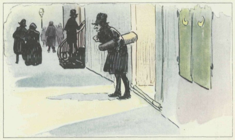 So in the evening when he slowly retraced his steps towards his attic home, his feet were very tired and he shuffled more than he had in the morning. His back humped and his head drooped more, and the tears nearly blinded him. He had to stop and rest at each flight of stairs and he fell to his knees just as he reached the attic door.