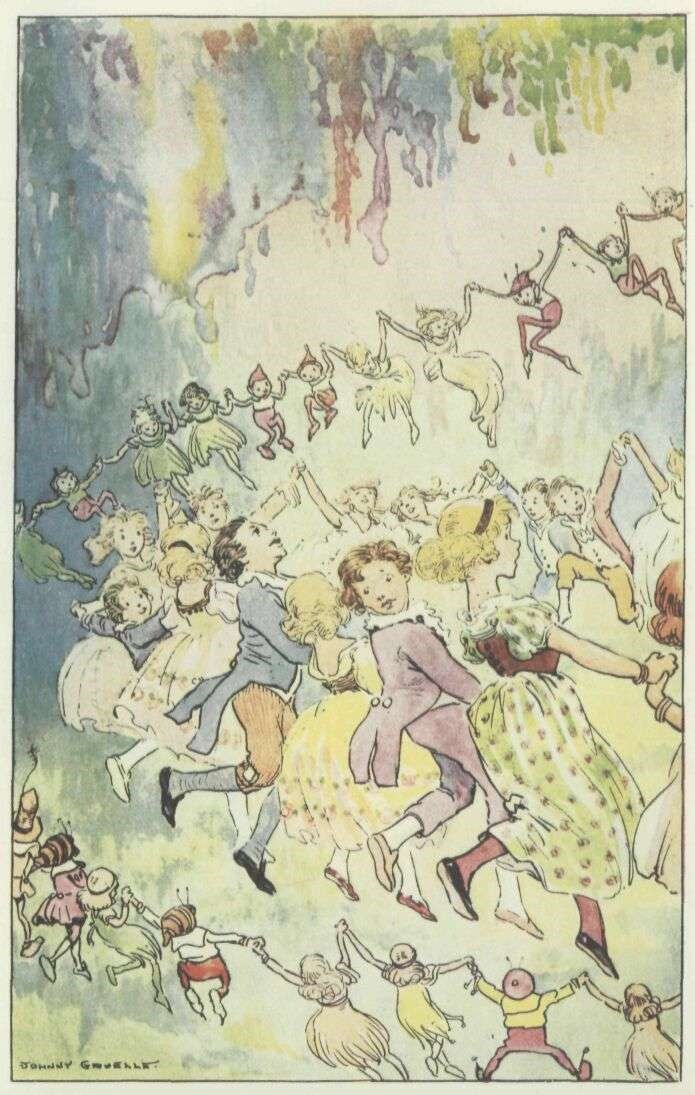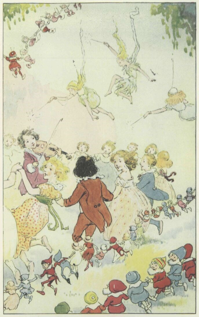 And, looking about him with shining eyes, he again drew his bow across the strings and played a tune so lively and full of sweet happiness the childhood friends caught hands and danced in a circle, and the little sprites, elves, gnomes and fairies caught hands and danced around the children, and as they passed before the brother he caught a mischievous glance from the eyes of one of the little fairies, and he knew in a moment she was the one who had played the old woman, and who had given him the iron ring....