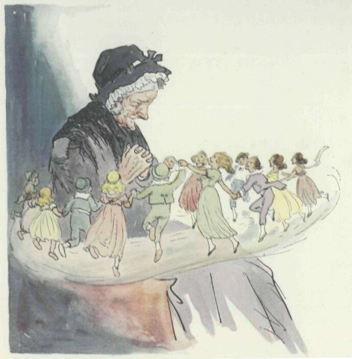 And, as she turned it, she saw the figures of her childhood playmates turn before her upon her lap, and they joined their voices with the silvery notes of the violin's long ago songs until the attic was filled with the melody and the figures danced from her lap and, taking her by the hand, circled in the center of the attic room laughing and singing.