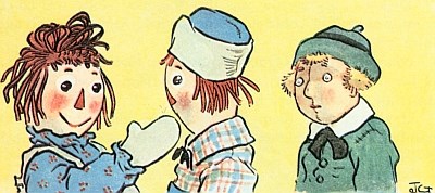 Raggedy Andy looked up into a cheery little round face, with a little red nose and red cheeks, and all framed in white whiskers which looked just like snow.