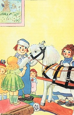 When he started rolling upon his shiny wheels, Raggedy Andy cried, "All aboard!" and, taking a short run, he leaped upon the wooden horse's back. Uncle Clem, Raggedy Ann, Henny, the Dutch doll and Susan, the doll without a head, all scrambled up into the pretty red wagon.