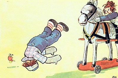 The wooden horse started rolling backward at this and knocked Henny over upon his back, causing him to cry "Mama!" in his squeeky voice.