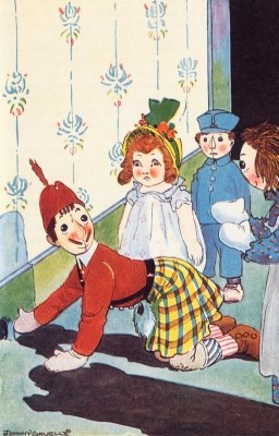 When Marcella was not in the nursery, Raggedy Ann wrestled with Boots and they would roll over and over upon the floor, Boots with her front feet around Raggedy Ann's neck and kicking with her hind feet.