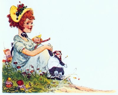 Marcella was having a tea party up in the nursery when Daddy called to her, so she left the dollies sitting around the tiny table and ran down stairs carrying Raggedy Ann with her.