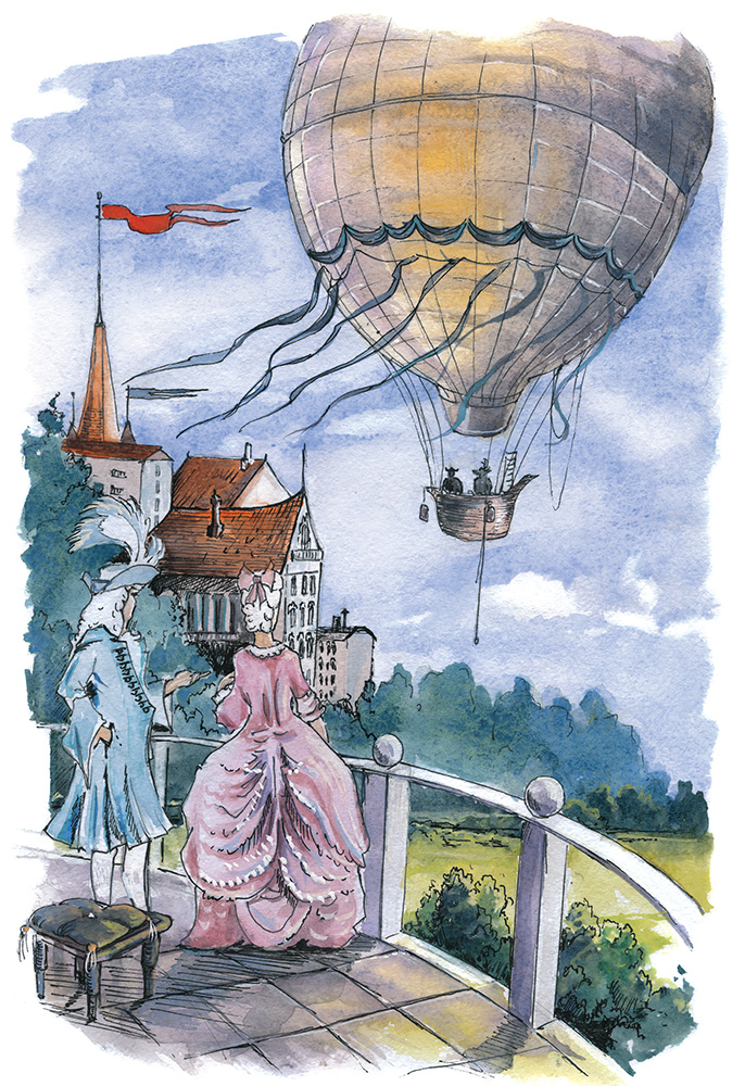 Для путешественников была сплетена круглая корзина из ивовых прутьев, в центре которой находился очаг. В него для поддержания огня воздухоплаватели подбрасывали солому. Под грохот пушечного салюта и крики огромной толпы они поднялись в воздух, ветер подхватил их, и скоро они скрылись из виду.