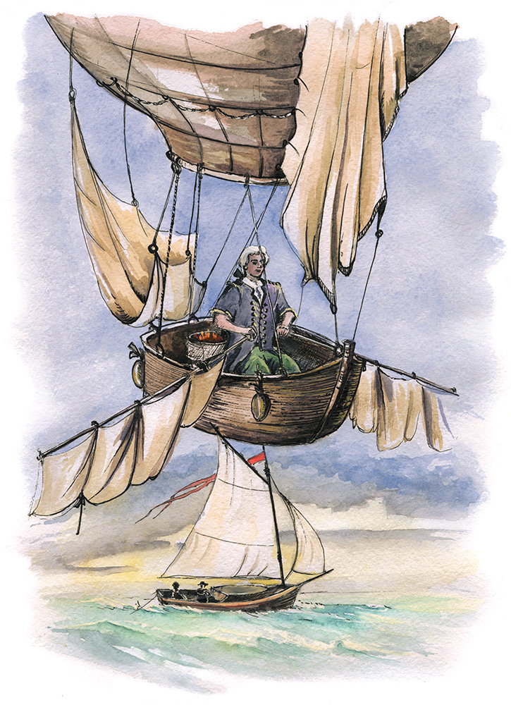 И вот французский механик Франсуа Бланшар решил приделать к аэростату легкие крылья и паруса. Но справиться с ветром это не помогло. Крылья были слабы, непрочны и попросту ломались, когда Бланшар, сидя в корзине, пытался ими махать.