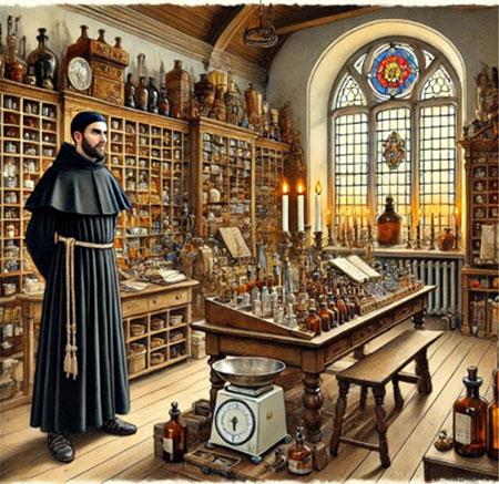 Вдоль стен стояли шкафы, заполненные сосудами, склянками и коробками, назначение которых для непосвященных оставалось загадкой. В центре комнаты возвышался большой рабочий стол с весами, горелкой и аккуратно разложенными предметами.