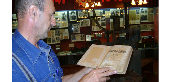 Автор держит книгу «Финансовый капитал», которую читал и делал на ней пометки товарищ Сталин