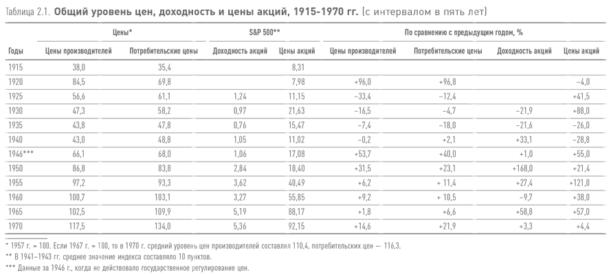 Как и в других финансовых вопросах, рассматривать будущую политику следует опираясь на прошлый опыт. Можно ли считать инфляцию (по крайней мере столь высокую, какую мы наблюдаем после 1965 г.) новым явлением для США? Если мы уже сталкивались с таким же, как сегодня, или более высоким уровнем инфляции, какие уроки сейчас можно извлечь из поведения инвесторов в прошлом? Начнем с таблицы 2.1, где представлена динамика общего уровня цен, доходности и рыночной стоимости акций с 1915 г., т. е. за 55 лет (с интервалом в пять лет). (Мы использовали данные за 1946 г., поскольку в 1945 г., во время Второй мировой войны, государство регулировало цены.)