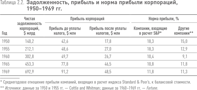 Данные таблицы 2.2 показывают, что инфляция не только не способствовала росту прибыли корпораций и доходов акционеров, но, напротив, приводила к их снижению. С 1950 по 1969 г. задолженность корпораций росла колоссальными темпами. Поразительно, как мало внимания экономисты и финансовые аналитики уделяют этой очевидной и тревожной тенденции. Корпоративный долг вырос почти в 5 раз, в то время как прибыль до налогообложения увеличилась немногим более чем вдвое. Учитывая значительный рост процентных ставок в этот период, становится понятно, что сегодня задолженность становится серьезной проблемой для многих компаний. (Обратите внимание, что в 1950 г. прибыль после уплаты процентов (но до уплаты налога) составляла примерно 30 % корпоративного долга, а уже в 1969 г. – всего 13,2 %. В 1970 г. этот показатель должен был снизиться.) Таким образом, значительная доля 11 %-ной прибыли на акционерный капитал была получена благодаря значительному объему новых займов, обслуживание которых обходится корпорациям примерно в 4 %. Если задолженность корпораций сохранится на уровне 1950 г., уровень доходности на акционерный капитал упадет еще ниже, несмотря на инфляцию.