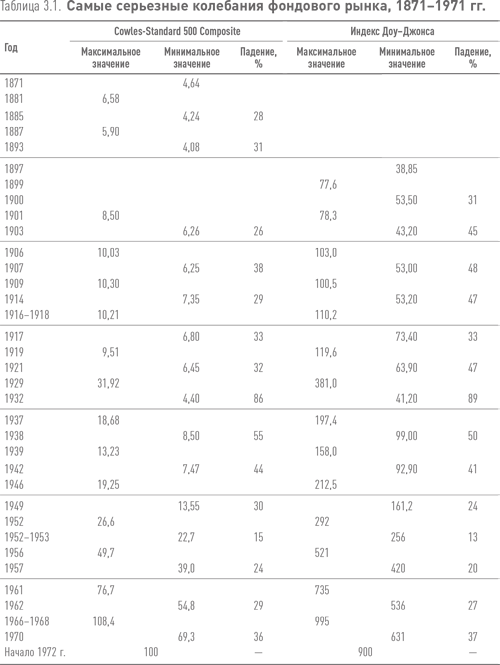 Вековая история фондового рынка представлена в двух таблицах и на графике. В таблице 3.1 содержатся данные о колебаниях фондового рынка (максимальные и минимальные уровни) в рамках 19 медвежьих и бычьих циклов за последние 100 лет. Мы использовали два фондовых индекса. С 1870 г. приводятся значения индекса Комиссии Коулса[69] (за более поздние годы представлены значения индекса широкого рынка Standard & Poor’s 500). Второй, еще более известный индекс – индекс Доу – Джонса, рассчитывать который начали в 1897 г. Этот индекс рассчитывается по акциям 30 компаний, включая American Telephone & Telegraph и 29 других крупных промышленных корпораций {1}.