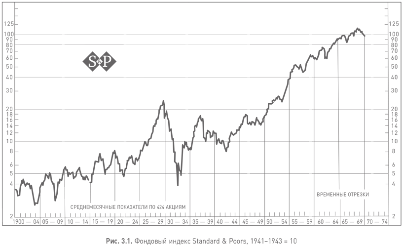 На графике (рис. 3.1), любезно предоставленном агентством Standard & Poor’s, показаны колебания фондового индекса, рассчитанного по акциям 425 промышленных компаний, с 1900 по 1970 г. (Динамика индекса Доу – Джонса выглядела бы примерно так же.) Читатель может заметить три модели поведения фондового рынка, каждая из которых охватывает примерно треть временного отрезка продолжительностью 70 лет. Первая модель, наблюдавшаяся с 1900 по 1924 г., характеризовалась рядом сходных рыночных циклов продолжительностью от 3 до 5 лет. На протяжении этого периода рынок рос в среднем на 3 % в год. Потом наступила «новая эра» бычьего рынка. В 1929 г. рост рынка достиг максимальных значений, после чего рынок обвалился, а затем вплоть до 1949 г. наблюдались неравномерные колебания курсов акций. Сравнение показателей 1949 и 1924 г. позволяет сделать вывод, что в этот период рынок рос не более чем на 1,5 % в год. Поэтому к середине XX в. энтузиазм участников рынка по отношению к акциям иссяк. Однако, как и следовало ожидать, маятник качнулся в другую сторону, и начался третий период, который ознаменовался самым высоким ростом котировок за всю историю фондового рынка. Эта модель фондового рынка отражена справа на рис. 3.1. Феноменальный рост рынка завершился в декабре 1968 г., когда индекс S&P 425 вырос до 118, а S&P 500 – до 108 пунктов). И хотя данные таблицы 3.1 показывают, что с 1949 по 1966 г. курсовая стоимость акций несколько раз падала (прежде всего в 1956–1957 и 1961–1962 гг.), рынок восстанавливался так быстро, что эти периоды принято считать (в долгосрочной перспективе) не самостоятельными циклами, а спадами на бычьем рынке. За 17 лет рынок вырос более чем в 6 раз: индекс Доу – Джонса поднялся со 162 пунктов в середине 1949 г. до максимума (995 пунктов) в начале 1966 г. (Рост индекса широкого рынка S&P был более значительным – с 14 до 96 пунктов.) Таким образом, рынок ежегодно рос в среднем на 11 % (без учета роста дивидендной доходности примерно на 3,5 % в год).