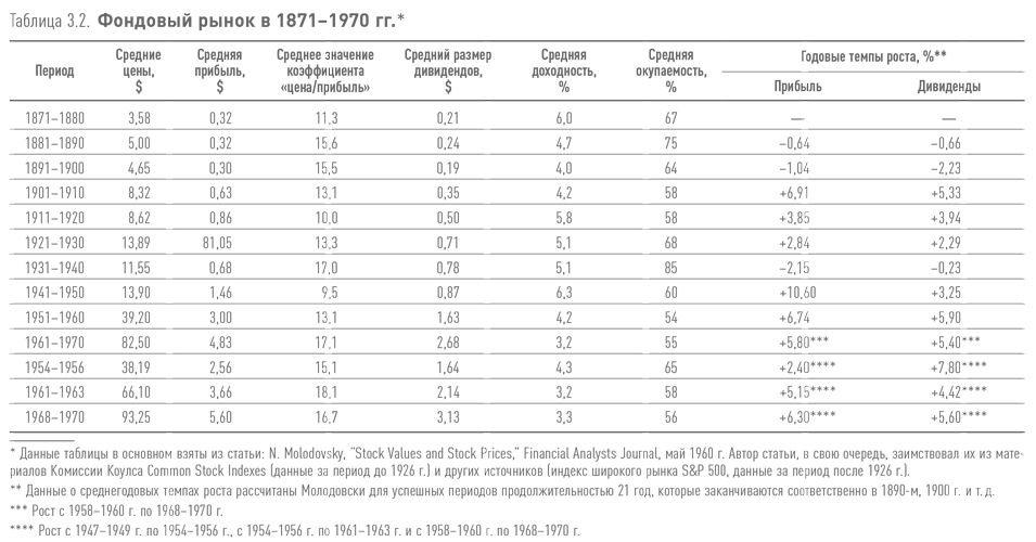Зная динамику цен акций, прибыли и дивидендов за 100 лет, можно попробовать сделать некоторые выводы о современном состоянии фондового рынка (значение индекса Доу – Джонса – 900, индекса Standard & Poor’s Composite – 100 пунктов), т. е. о ситуации, сложившейся к январю 1972 г.
