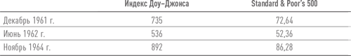 Дальнейшие события подтвердили обоснованность предостережения, высказанного в 1959 г., более убедительно, чем прогнозы, сделанные в 1954 г., но все оказалось не так страшно. В начале 1961 г. индекс Доу – Джонса поднялся до 685 пунктов, затем в том же году упал до 566 пунктов и вскоре снова вырос до 735 пунктов, а в мае 1962 г. на фоне паники на рынке снизился до 536 пунктов. Всего за полгода убытки составили 27 %. Одновременно резко упали акции безусловного лидера рынка – компании International Business Machines – с 607 в декабре 1961 г. до 300 пунктов в июне 1962 г.