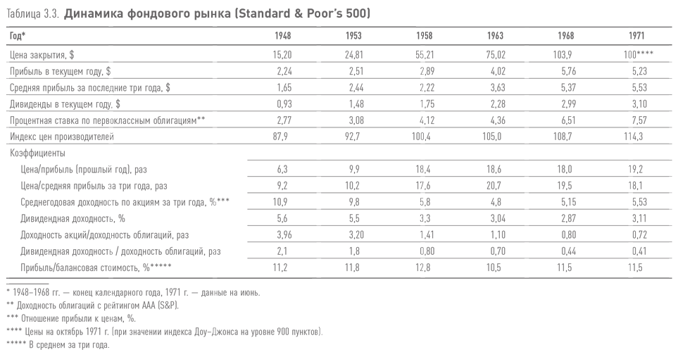 В отдельные периоды 1971 г. значение фондового индекса Доу – Джонса находилось на отметке 892 пункта, как и в ноябре 1964 г. (эта динамика подробно рассматривалась в предыдущем издании книги). При подготовке нового издания мы решили использовать индекс Standard & Poor’s 500, поскольку этот индекс широкого рынка полнее отражает ситуацию, чем индекс Доу – Джонса, который рассчитывается на основе акций всего 30 компаний. Особое внимание мы решили обратить на четыре периода, которые рассматривались в четырех предыдущих изданиях (конец 1948, 1955, 1958 и 1963 гг., а также 1968 г.). Текущий курс акций примем за 100 %. Наши расчеты представлены в таблице 3.3. Данные по доходности представлены как за последний год, так и в среднем за три календарных года. Дивиденды за 1971 г. рассчитаны за последние 12 месяцев, процентные выплаты по облигациям и цены в 1971 г. – по состоянию на август 1971 г.