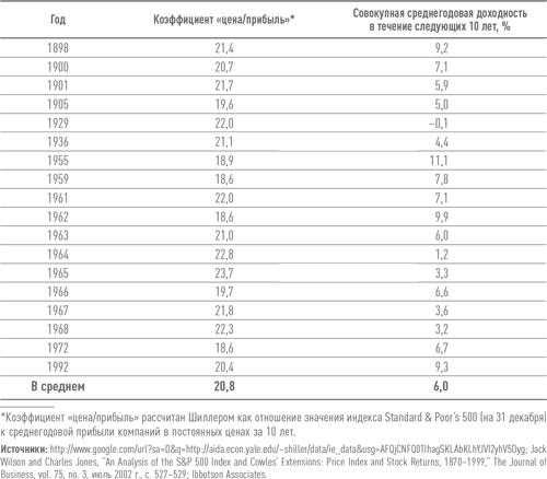 Профессор финансов Роберт Шиллер (Йельский университет) уверяет, что Грэм вдохновил его на разработку собственного подхода к оценке акций. Шиллер сравнивает текущее значение фондового индекса Standard & Poor’s 500 со средними показателями прибыли корпораций за последние 10 лет (с учетом инфляции). Анализируя данные предыдущих периодов, Шиллер показал, что, когда этот коэффициент был значительно выше 20, впоследствии фондовый рынок обычно демонстрировал низкую доходность. Когда же коэффициент был намного ниже 10, в последующем акции обычно приносили неплохую доходность. В начале 2003 г., согласно расчетам Шиллера, стоимость акций была примерно в 22,8 раза выше средней корпоративной прибыли (с учетом инфляции) за последние 10 лет. Ситуация была опасной, но не настолько, как при запредельном значении показателя в декабре 1999 г. (44,2).