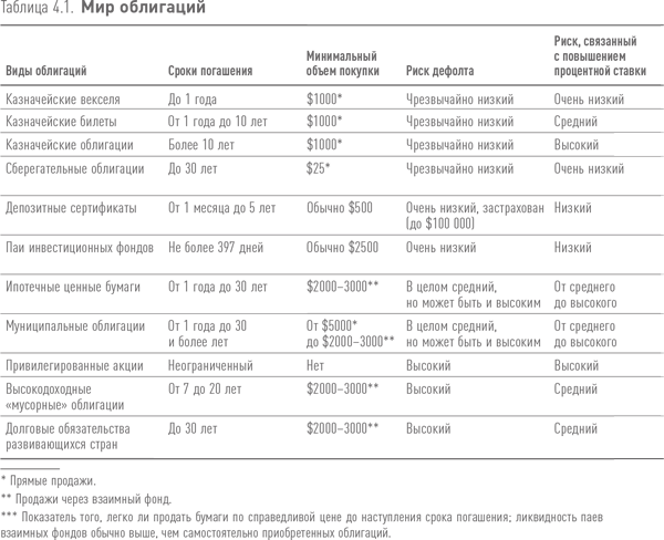 Облигации или паи облигационных инвестиционных фондов? Поскольку облигации в основном продаются лотами стоимостью $10 000, а вам, чтобы диверсифицировать риски, нужно иметь в портфеле минимум 10 видов облигаций, самостоятельно приобретать облигации следует лишь в том случае, если у вас есть по крайней мере $100 000. (Единственное исключение – казначейские облигации, выпускаемые под гарантии государства.)
