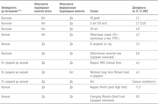 Сегодня инвесторы получили в свое распоряжение целый ряд инструментов, которых не было во времена Грэма. Что касается процентных ставок, то в 2003 г. они упали так низко, что инвесторы были готовы хвататься за любые бумаги, лишь бы повысить доходность. Существуют инструменты, позволяющие сделать это практически без риска[93]. Сравнительные характеристики облигаций представлены в таблице 4.1.