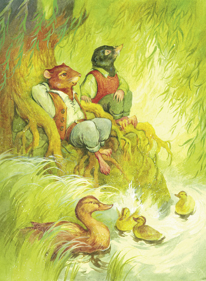Дядюшка Рэт сидел на берегу реки и напевал песенку. Он только что ее сам сочинил, и она, надо сказать, очень ему нравилась. Он не обращал внимания ни на Крота, ни на кого бы то ни было вообще. Он с раннего утра досыта наплавался в реке вместе со своими друзьями утками. Когда вдруг утки неожиданно становились в воде вниз головой, как это свойственно уткам, он тут же нырял и щекотал им шейки, как раз в том месте, где мог оказаться подбородок, если бы он у них был, до тех пор щекотал, пока им не приходилось торопливо выныривать на поверхность. Они выныривали, разбрызгивая воду, сердясь и топорща свои перышки, потому что невозможно сказать все, что ты о ком-то думаешь, когда у тебя голова под водой. Под конец они уже просто взмолились и попросили его заняться своими собственными делами и оставить их в покое. Ну вот, дядюшка Рэт и отстал от них, и уселся на бережку на солнышке, и сочинил про них песенку, которую он назвал